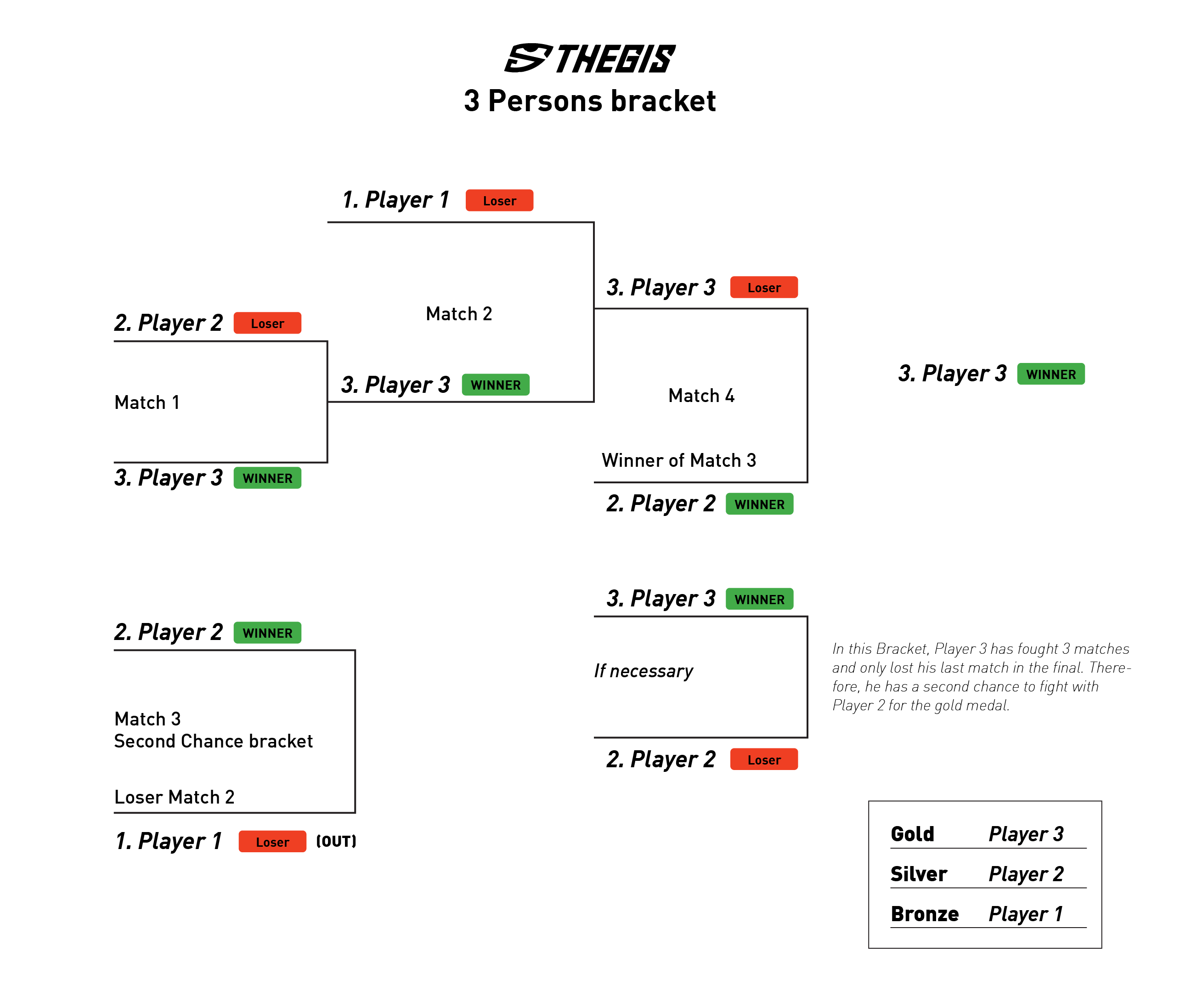 VĐV thua trận đầu tiên sẽ được xếp vào Loser Pool. Nếu tiếp tục thắng các trận sau, VĐV vẫn có cơ hội tranh Huy chương Vàng. Mỗi VĐV đảm bảo có tối thiểu 2 trận đấu.