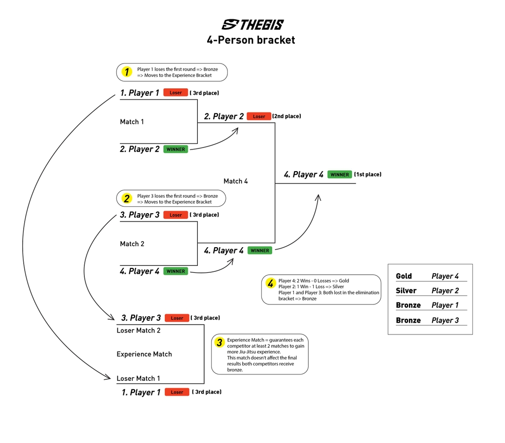 If an athlete wins 2 matches in a row → they receive the Gold medal.